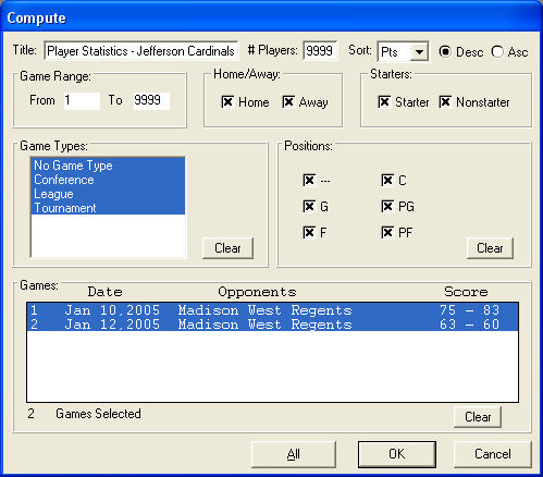 With the Compute Screen you can quickly compute any report for any combination of games. You can rename the report, select the number of players you want to show based on the sort order, select a range of games, select home or away games, select starters or nonstarters, select game types which you create, select fielding positions and even select individual games.