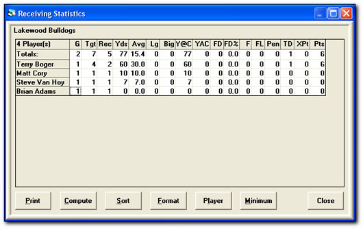 This is the Receiving Statistics Report. Other reports available with StatTrak are Game Scores, Team Record, Standings, Passing, Rushing, Defense, Kicking, Returns. Click Compute to compute the report for any combination of games (see screen below). Click Sort to sort the report on any category. Click Minimum to divide the report based on a minimum number of games played.